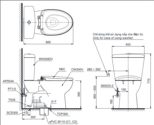 - Tâm xả: 305mm ( bao gồm bích nối sàn)