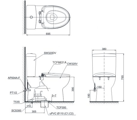 Mã sản phẩm CS320DRW7 là sự kết hơp giữa thân cầu C320R, két nước S320D và nắp rửa điện tử đa chức năng TCF6631A (220V)