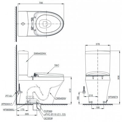 - Mã sản phẩm CS945DNW11 là sự kết hợp giữa thân cầu C945N, két nước S945DN và nắp rửa điện tử TCF4911Z ( 220V)
