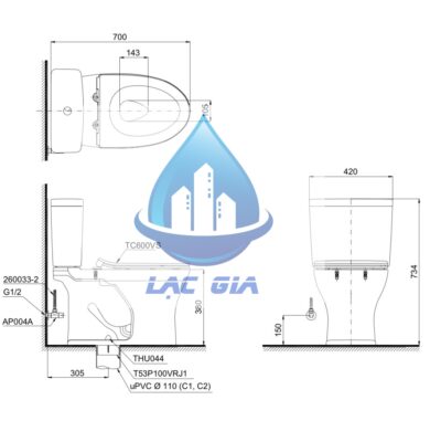 - Tâm xả: 305mm ( bao gồm bích nối sàn và van dừng)