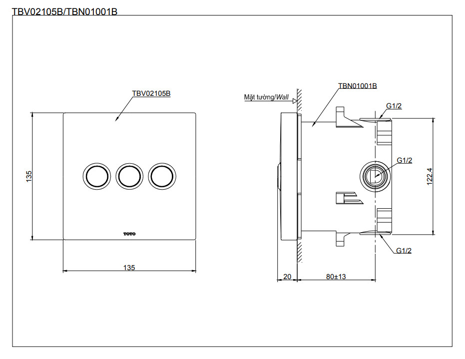 - TBV02105B/TBN01001B là bộ chuyển hướng 3 đường nước dạng nhấn và phụ kiện âm tường của thương hiệu thiết bị vệ sinh TOTO