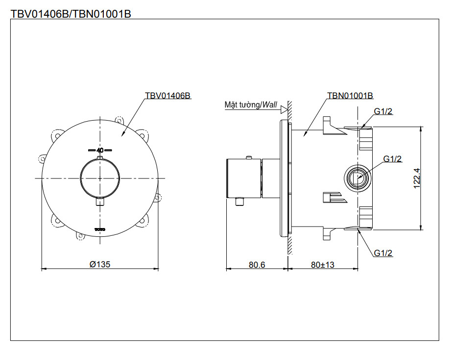 - TBV01406B/TBN01001B là van điều chỉnh nhiệt đồ kèm van dừng và phụ kiện âm tường của thương hiệu thiết bị vệ sinh TOTO