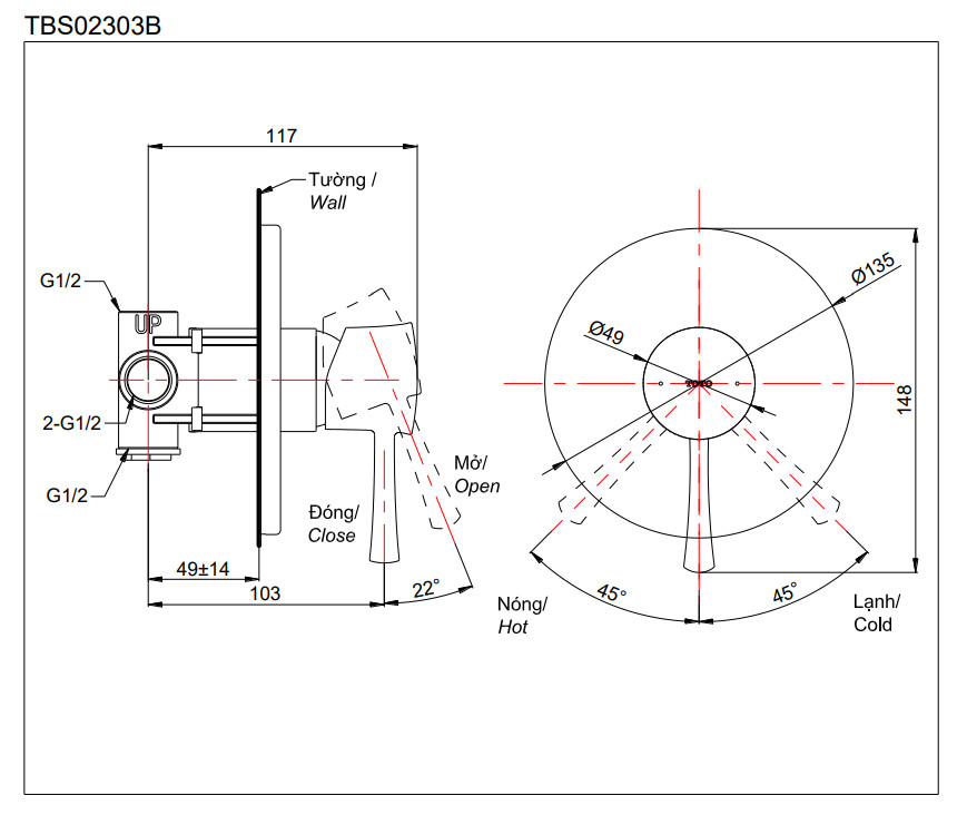 - TBV02303B là van gật gù điều chỉnh nóng lạnh dòng LN của thương hiệu thiết bị vệ sinh TOTO